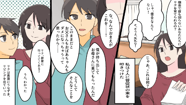 息子を守りたい主人公は夫と義母のもとを訪ね、息子と養子縁組することを宣言しました。 そして反発してくる夫と義母に、息子から受け取った夫と義母への督促状を突きつけたのです。