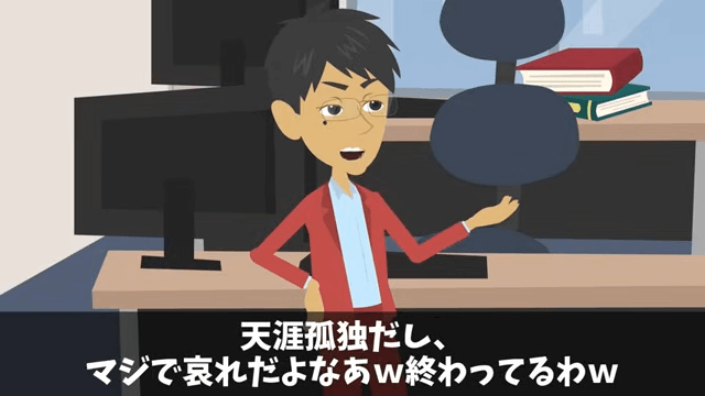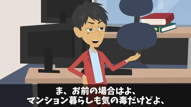 狭い家に住む主人公がかわいそうだと言う同僚。 さらに同僚は、結婚もしていない主人公に「マジで哀れだよなあ、終わってるわ」と言い放ち…。