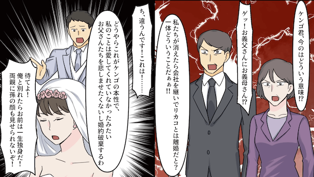 今回は『結婚式に元カノを招待して嫁サゲする夫の話』を紹介します。 元カノとの浮気を認め、主人公の両親の会社を乗っ取るつもりだったと暴露した婚約者。 さらに婚約者は「真面目なふりをして気に入られたら余裕だっての!」と両親をバカにするような発言をして…。