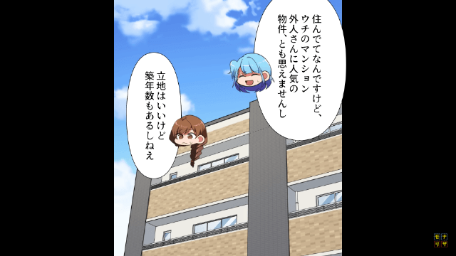 引っ越しシーズンでもない今、海外の人たちがマンションに出入りしていることを不思議に思っていた主人公たち。 主人公たちの暮らすマンションは立地がいいものの古く、海外の人に人気があるとは思えなかったのです。