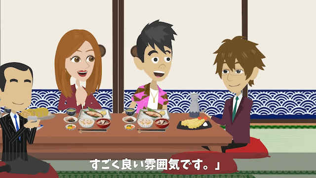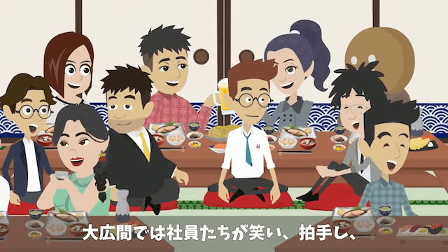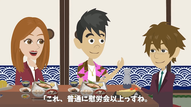 来店した人数の多さに驚きつつも喜び、活気が戻った店内で働く女将と料理人。 主人公も慰労会を楽しみ、和の空間に癒されたのでした。