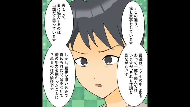 主人公が家事について妻に尋ねると、妻はまったく答えることができませんでした。 自分が家事をしていることを証明した主人公は、勝手な思い込みで責められたり、嘘をつかれたりするのは不愉快だと義母たちに伝えます。
