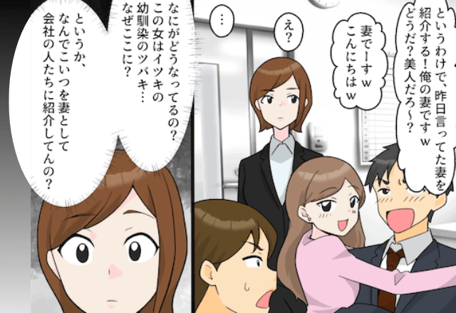 主人公は将来のために貯金が必要だと夫に伝え、その後、無事に旅行先が決定しました。 そんなある日、主人公が仕事で夫の会社に行くと、なんと夫が幼なじみを自分の妻だと紹介している現場に遭遇したのです。