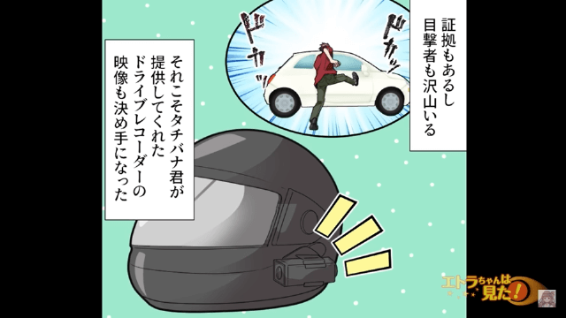 主人公の車は男性に執拗に蹴られたせいでへこんでしまっており、主人公は幼なじみの勧めで被害届を出すことに。 その後、幼なじみが提供してくれたドライブレコーダーの映像が決め手になり、男性は逮捕されたのです。
