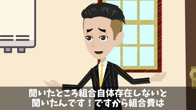 部長の妻は、部長に主人公が組合費を払わないことを伝えました。 そこで主人公は、組合が存在しないため、組合費は払えないと部長に説明します。
