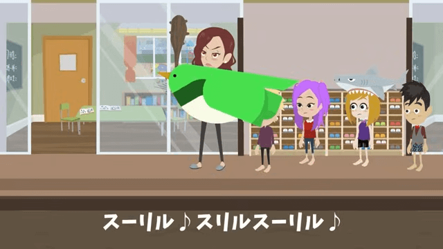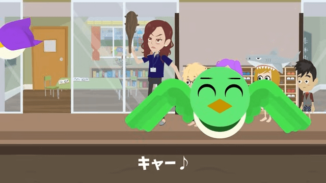 子どもたちがゲームの話をしていたと気づき、ごまかそうとする先生。 すると鳥たちにからかわれ、先生は鳥たちに激怒したのでした。