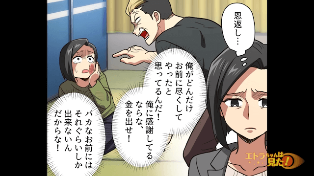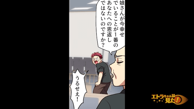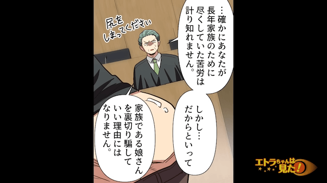 「俺はもう十分家族のために尽くしたんだよ!」と自分の行動を正当化しようとする幼なじみの父親。 しかし幼なじみの母親や裁判官は、それは幼なじみをだましていい理由にはならないと伝えます。