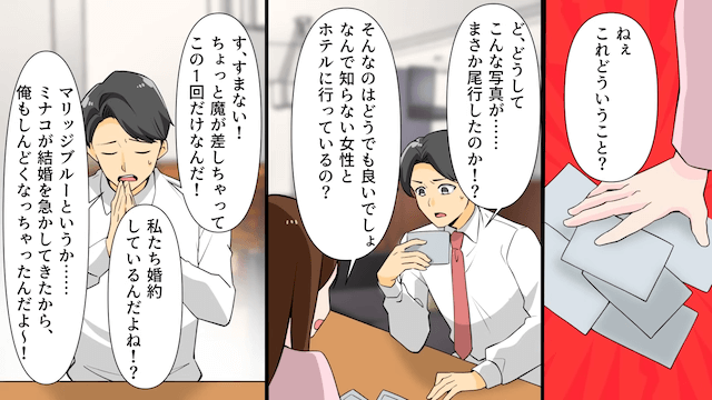 婚約者は付き合った当初から平日しか会えず、家にも入れてくれませんでした。 主人公がそんな婚約者のことを疑って調べてみたところ、なんと浮気が発覚し、主人公は別れを告げたのです。