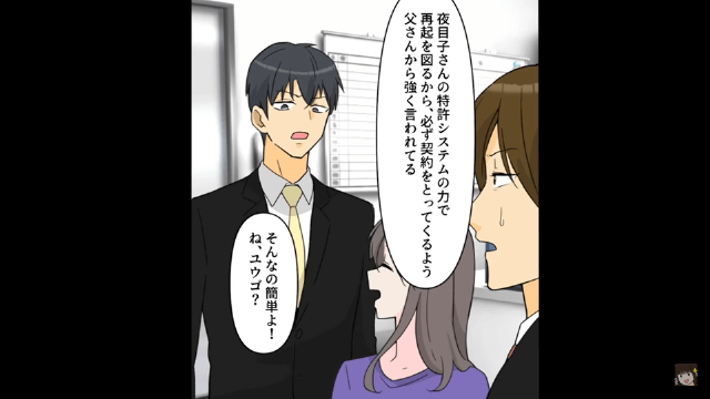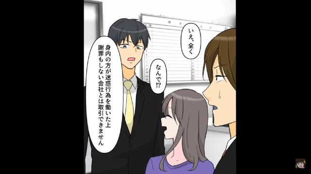 別れた彼女が主人公の会社に突撃すると、そこには商談のために来た浮気相手がいました。 浮気相手は自分の父が経営する会社の売上のため主人公の会社と契約したいと思っていたのですが、主人公は「身内の方が迷惑行為を働いたうえ謝罪もしない会社とは取引できません」と言って…。