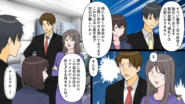今回は『俺の年収を勘違いして浮気した彼女』を紹介します。 別れた彼女が主人公の会社に突撃すると、そこには商談のために来ていた浮気相手がいました。 浮気相手は自分の父が経営する会社の売上のため主人公の会社と契約しなければいけなかったのですが、主人公は「身内の方が迷惑行為を働いたうえ謝罪もしない会社とは取引できません」と言い放って…。