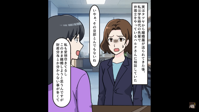 今回は『突然、夫「財産分与の振込いつ?」私「え?離婚しないわよ?」⇒勘違いしていた夫の末路』を紹介します。 主人公から婚姻費用を請求された夫は、離婚を宣言して堂々と浮気相手のもとへ向かいました。 その後、主人公との離婚が成立したと思い込んだ夫と浮気相手が、主人公の両親の遺産を財産分与として振り込むよう言ってきたのですが…。