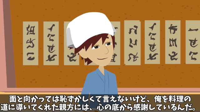 親方の寿司に感動した主人公は中学卒業と同時に弟子入りし、親方に料理の基礎を叩きこんでもらいました。 そして主人公が大きく成長したころに母が亡くなり、主人公は今の家族と楽しく暮らしていたのです。