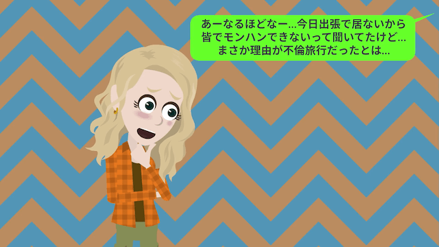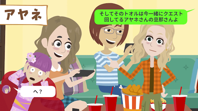 主人公は嬉しそうなママ友に困惑しつつ、夫が家でゲームをしていることを伝えました。 ママ友は主人公の強がりだと捉えて笑いますが、ママ友が温泉旅行をしている相手が夫ではなく男性だと判明。