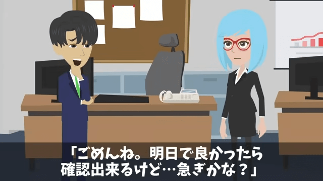 主人公は後輩に、今日は外回りに行かなければならないことを伝えました。 そして「明日でよかったら確認できるけど、急ぎかな?」と後輩に尋ねると…。