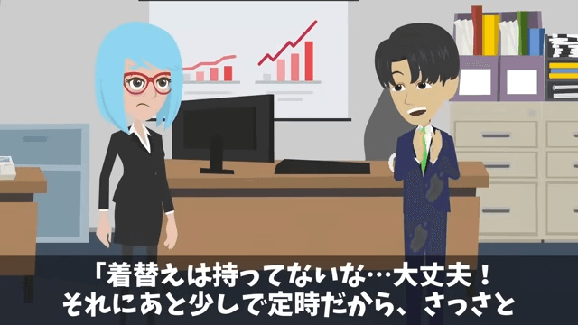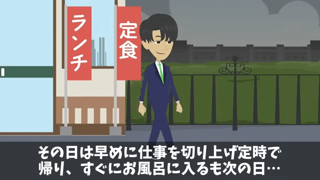 ずぶ濡れで帰ってきた主人公を見て「体調崩さなかったらいいんですが…」と後輩は心配します。 そして主人公は早めに仕事を切り上げ、すぐにお風呂に入ったのですが…。