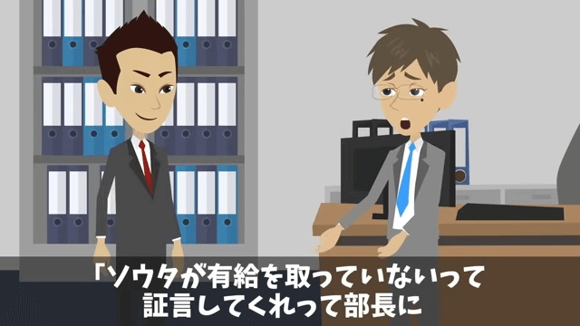 部長から証言してほしいと頼まれた課長は、焦って先輩に声をかけました。 そして課長は、先輩に主人公が有給を取っていたかどうか確認します。