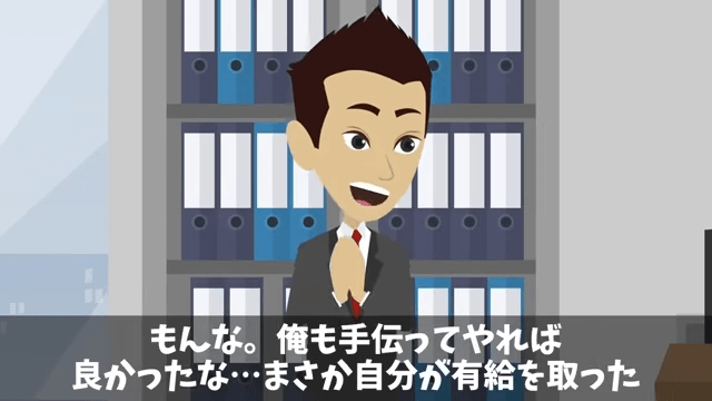 先輩が主人公は有給を取っていたと断言し、驚く主人公。 そして先輩は、最近の主人公はとても忙しそうだったと話を続けて…。