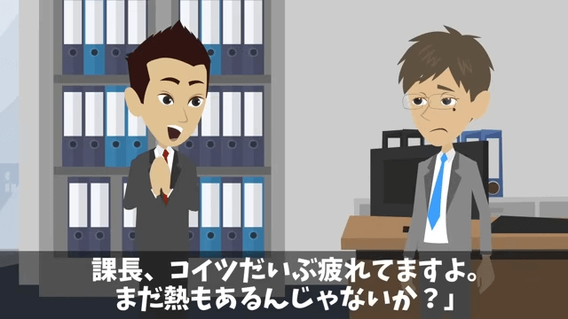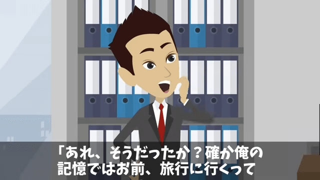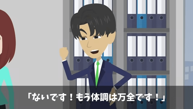 先輩は主人公が有給を取ったことを忘れているのだと言います。 そして先輩が「まだ熱もあるんじゃないか?」と聞くと、主人公は「ないです!もう体調は万全です!」と答えました。