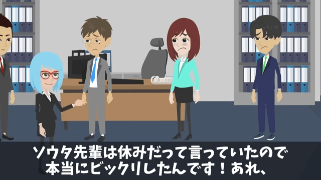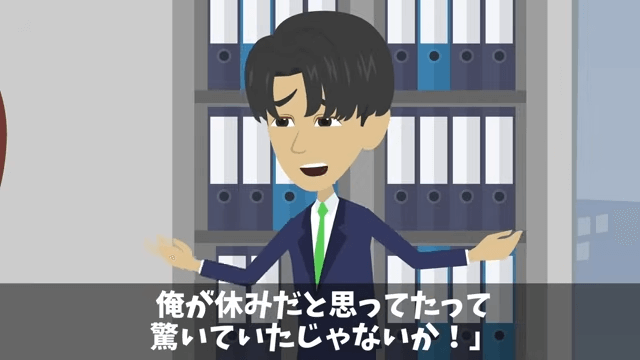 主人公は仕事中に後輩に会った日のことを確認しました。 すると後輩は、課長から主人公は休みだと聞いていたからとても驚いたと話して…。