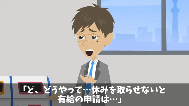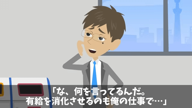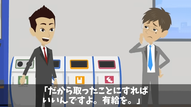 課長の話を聞いた先輩は「こんなの簡単なことですよ」と言います。 そして先輩は、主人公が有給を取ったことにすればいいと課長に伝えました。