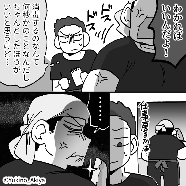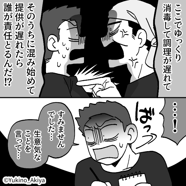 トイレから戻ってきた店長が手の消毒をせずに調理をしていたため、恐る恐る指摘した主人公。 すると店長は激怒して「提供が遅れたら誰が責任とるんだ!?」と主人公を責めます。 そのため主人公は納得ができなかったものの、店長に謝罪をしたのでした。