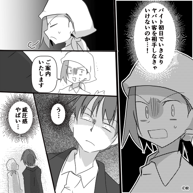 回転寿司でアルバイトを始め、緊張しながら仕事をしていた主人公。 すると1人の男性客が来店し、大声で騒ぎ始めました。 主人公が困惑していると先輩が「あの人は要注意人物だから…」と教えてくれたのですが、主人公が男性客を席に案内することになり…。