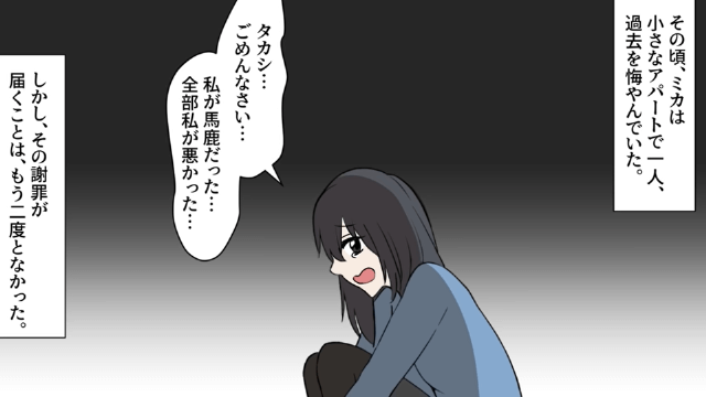 10年同棲した主人公を裏切った婚約者は、手元に借金しか残らず自分の行動を後悔することに。 主人公はいつかお金目当てではなくありのままを愛してくれる人と出会えることを信じ、新しい生活をスタートさせたのでした。