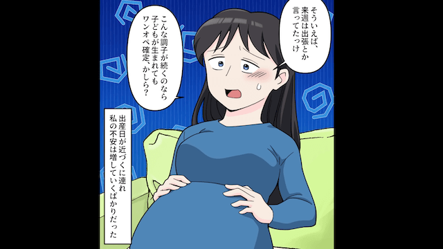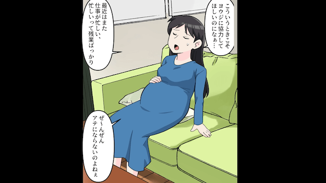 主人公が浮かれているため、子どもに嫉妬し、チヤホヤしてもらえる他の場所を探そうと企んだ夫。 一方、お腹が大きくなった主人公は、仕事ばかりの夫があてにならないため不安を感じます。