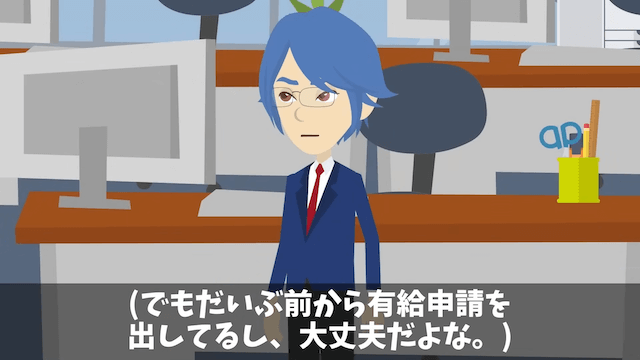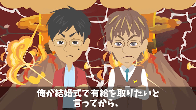 結婚式のために、会社に有給申請をした主人公。 後輩は快く送り出してくれたのですが、課長と部長は主人公の有給が気に入らないようで、嫌がらせをしてきます。