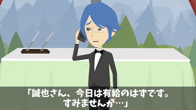 今回は『結婚式で有給申請すると…上司「社長がクビだってさ」⇒真実を伝えた結果』を紹介します。 有給申請が承認されないまま、結婚式当日を迎えてしまった主人公。 式場で準備をしていると、課長と部長から電話がかかってきて…。