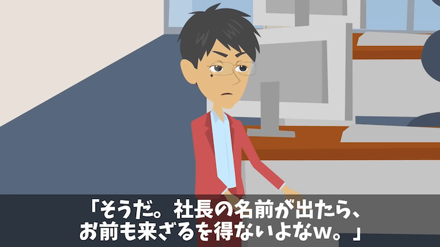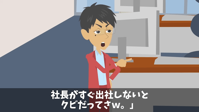 会社が潰れるかもしれないと主人公を脅し、直接謝罪に行くように指示してくる課長と部長。 これは社長命令だと2人は言い「社長がすぐ出社しないとクビだってさ」と主人公に伝えてきます。