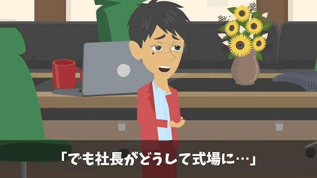 驚愕した課長と部長は、なぜ社長が主人公の結婚式にいるのか疑問に思い…。