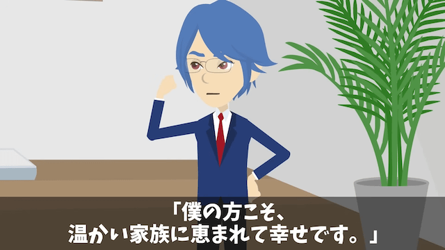 今回は『結婚式で有給申請すると…上司「社長がクビだってさ」⇒真実を伝えた結果』を紹介します。 娘の顔を見るために、主人公夫婦の家に来ていた義両親。 主人公は義父に、課長と部長の様子を伝えて…。