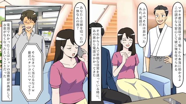 怒った主人公は夫に離婚を突きつけ、離婚理由は内緒にすることを条件に夫と離婚します。 その後、主人公は再婚し幸せに暮らすのですが、ある日元夫から電話がかかってきました。