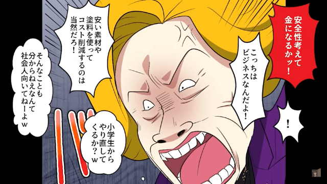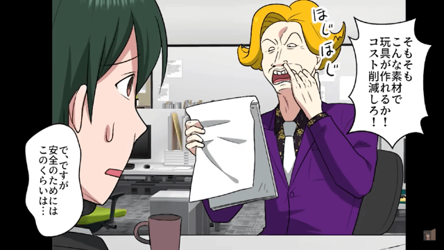 部長に目をつけられ、毎日のように叱られていた主人公。 さらに部長は子どもが使うおもちゃの安全性を考えず、コスト削減ばかりを勧めてきて…。