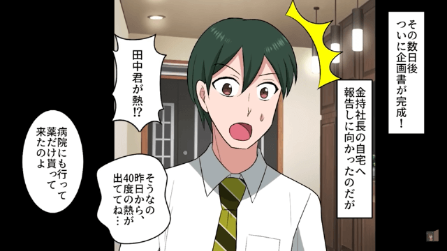 今回は『40度の高熱で寝込む子どもを看病する俺に出勤を強要した上司の末路』を紹介します。 実際に社長の子どもと遊んだ主人公は、いろいろ気づく部分があり、今までになかったアイデアを考えられそうでした。 それから主人公と社長はよく話すようになり、部長はそんな様子を悔しそうに見ていたのです。