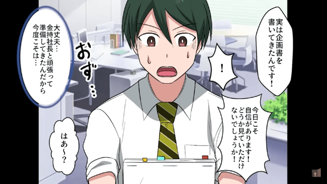 主人公は社長の子どもの看病のため会社を休もうとしましたが、部長からは「ガキは放って仕事優先しろ!」と言われてしまいました。 そこで主人公は仕方なく出社し、社長と一緒に作った企画書を部長に提出したのですが…。