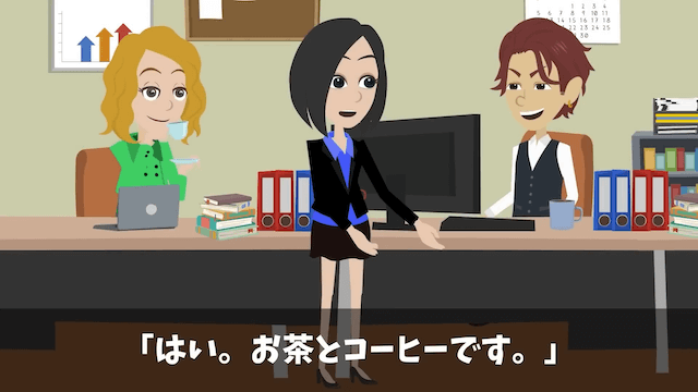飲み物は各自で用意するルールになっているにもかかわらず、主人公に命令をして急かしてくる上司たち。 2人の圧に逆らえず、主人公は結局2人の飲み物を用意したのでした。
