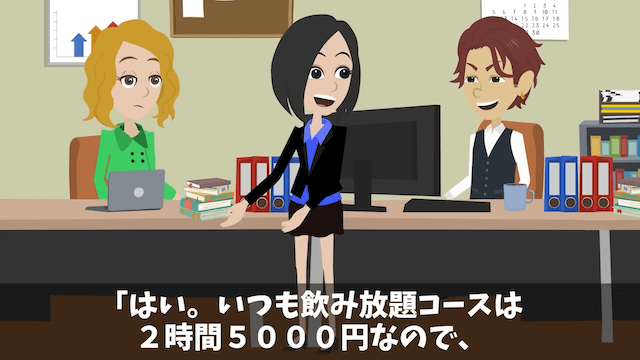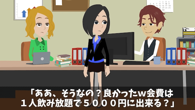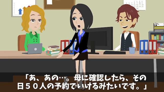 主人公が母に電話をするため離席すると、男性上司は「これはおもしろいことになるぞ」と言って悪い顔をしました。 その後、電話を終えた主人公が男性上司に予約が可能だと伝えると、男性上司は会費を1人5000円にしてほしいと主人公にお願いしたのでした。