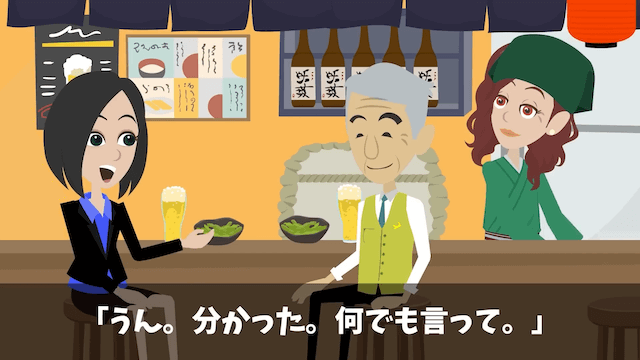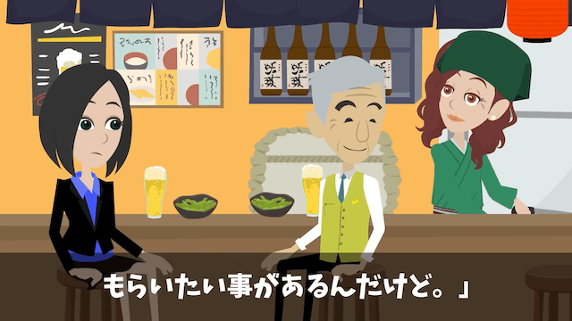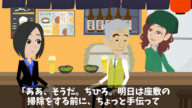 常連客に「今日は一緒にお酒に付き合ってくれないかな?」と言われ、母の勧めもあって承諾した主人公。 その後、料理中の母から「明日は座敷の掃除をする前にちょっと手伝ってもらいたいことがあるんだけど」と頼まれ、主人公は「わかった」と返事をしたのでした。