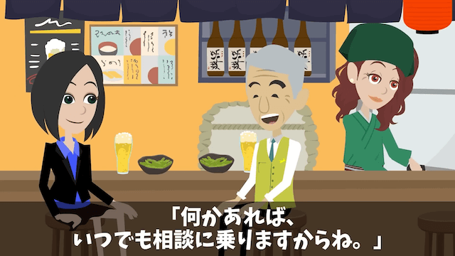 料理を注文した常連客は、主人公に「会社はどうかな?」と尋ねました。 そこで主人公が緊張しつつ「よくしてもらってます」と答えると、常連客は「なにかあれば、いつでも相談に乗りますからね」と親身になってくれたのです。
