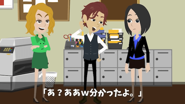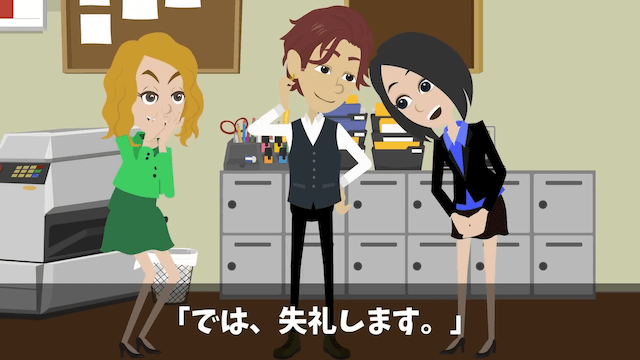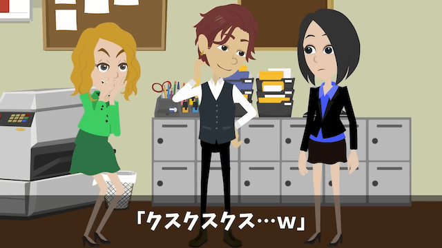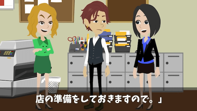 忘年会当日、店の準備をするために定時であがることを男性上司に報告した主人公。 男性上司は了承してくれたのですが、そのそばで女性上司がクスクスと笑っていたのでした。