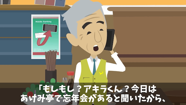 今回は『実家の居酒屋で忘年会50人の予約が当日キャンセルされた話』を紹介します。 だまされた主人公を笑い、主人公の悪口を言い合っていた上司たち。 すると男性上司のスマホに、ある人物から電話がかかってきて…。