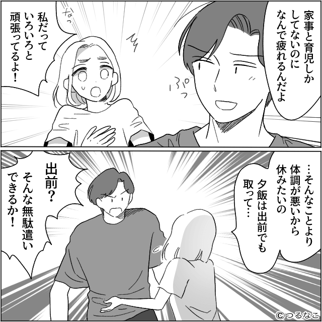 主人公の意識が戻り時計を見ると、自分が15分ほど倒れていたことがわかりました。 するとそこに夫が帰宅したため、主人公は疲れて体調が悪いことを報告しますが、夫は「家事と育児しかしてないのになんで疲れるんだよ」と鼻で笑い…。
