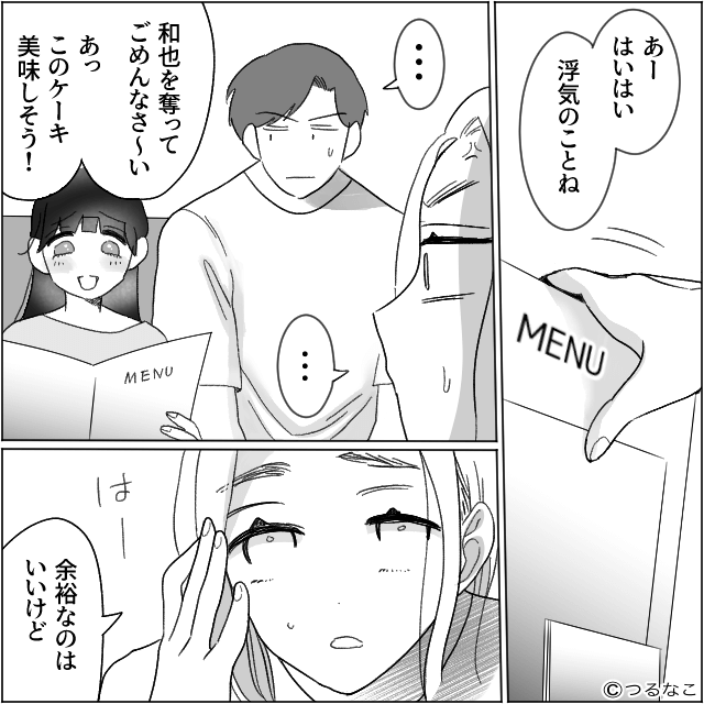 話し合いの時間に、遅れて到着した夫と浮気相手。 浮気相手は主人公を見るなり「思ってたよりおばさんじゃーん」と笑い、余裕そうな態度をとります。
