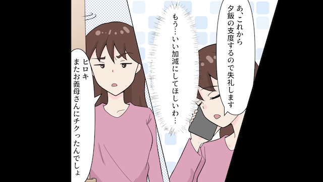 兼業主婦をしている主人公が毎日忙しくしているにもかかわらず、夫は一切家事をしてくれませんでした。 さらに夫は少しでも主人公に注意されると義母に伝え、義母から主人公に怒りの電話がかかってくるのです。