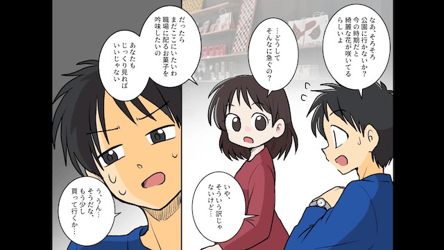 夫は主人公に「そろそろ公園に行かないか?」と誘いましたが、主人公が「どうしてそんなに急ぐの?」と尋ねると、夫は本当の理由を言えずに挙動不審になってしまいました。