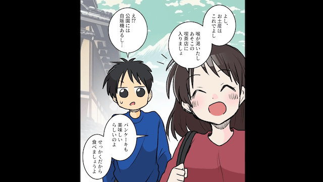 お土産の買い物が終わり、主人公が「喫茶店に入ろう」と誘うと、夫は「公園に自動販売機がある」と言って、またもや公園に早く行きたがりました。