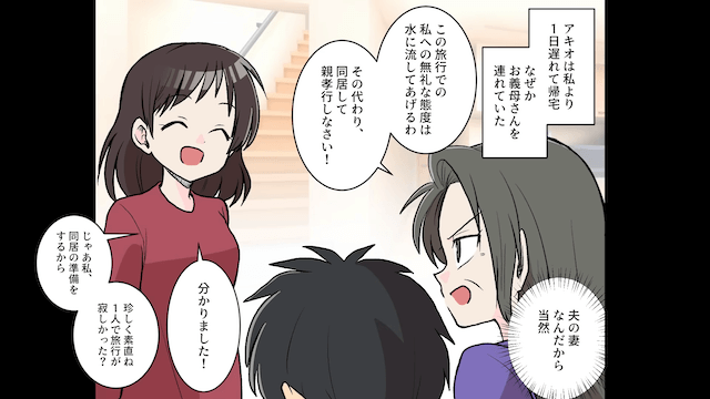 今回は『義母「同居して親孝行しなさい」私「わかりました!」⇒お望み通りにした結果』を紹介します。 主人公をだまし、旅行に義母を合流させようとしていた夫。 夫と義母の企みに気づいた主人公は「そんなのお断りですから」とはっきり拒否して…。