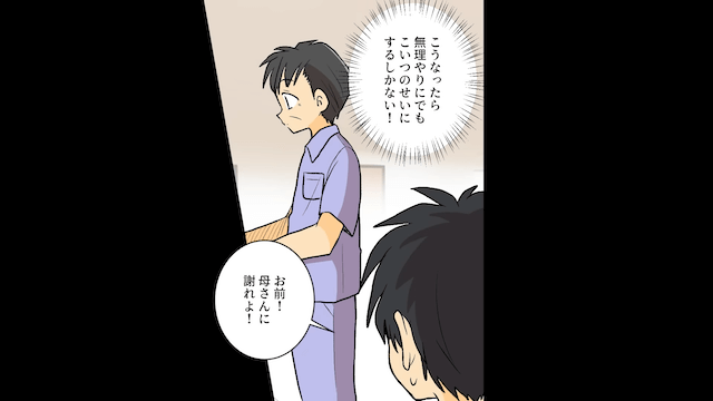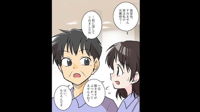 主人公が詳しく話を聞くと元夫と義母は焦り始め、近くにいた男性がぶつかった犯人だと言いました。 しかしその男性は施設長で、後に引けなくなった2人は施設長に謝罪を求めます。